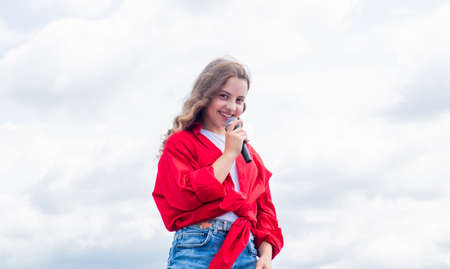 piece of music. make your voice louder. teen girl singing song with microphone. having a party. Happy kid with microphone. karaoke concept. Singing Songs. Lifestyle and People Concept