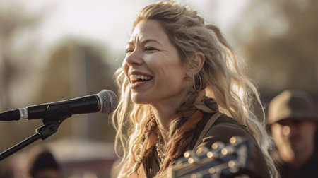 Country Singer Female Caucasian Mature Performing live music for an audience, singing country songs in Outdoor stage. Generative AI AIG22.