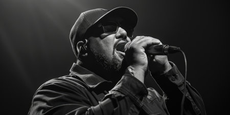 middle east hip hop performer in sunglasses and cap singing in microphone on black, banner
