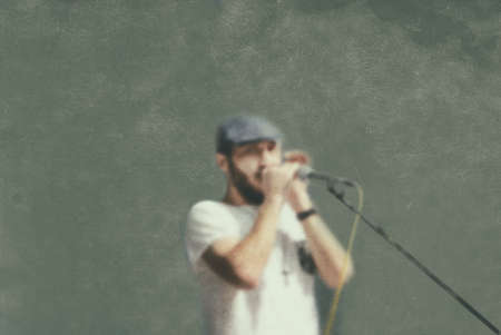 Repetition of retro music band at music studio. Young musician playing acoustic guitar and singing. Rehearsal base. Concept of art, music, style and creation