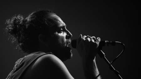 Handsome man recording a song. Focused on the microphone. Space for your text.