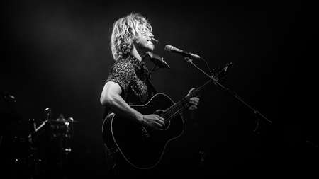 A woman with long blonde hair sings on stage, wearing a grey t shirt and blue jeans, in a crowded venue