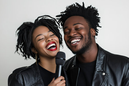 Portrait of a young african american couple singing together with microphone.