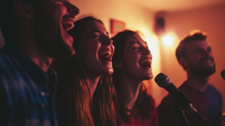 Lively gathering of people in dimly lit room singing karaoke. High quality photo