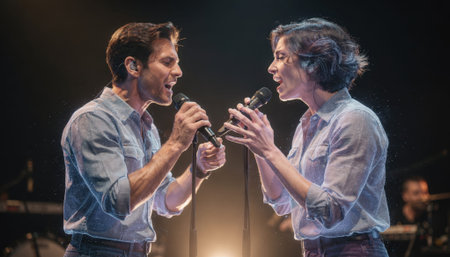 A striking image of passionate vocalists performing in harmony, showcasing emotion and connection, illuminated by stage lights, capturing the essence of live music and community spirit.