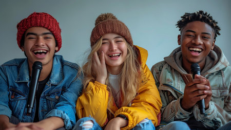 Multiethnic group of young people singing karaoke in the studio