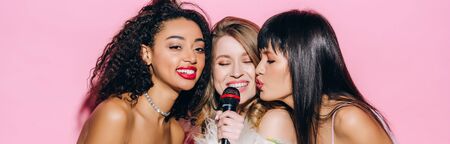 panoramic shot of cheerful multicultural girls singing karaoke with microphone, isolated on pink