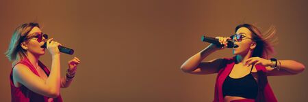 Caucasian female singer portrait on gradient studio background in neon light. Beautiful female model with microphone. Concept of human emotions, facial expression, ad, music, art. Flyer with copyspace.