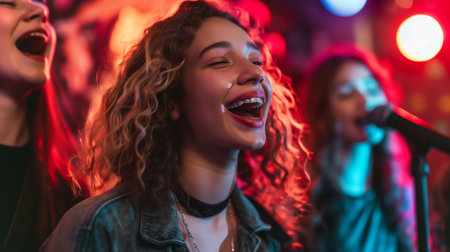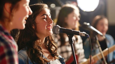 A group of young girls passionately singing in unison, showcasing their vocal talent and enthusiasm in a beautifully lit environment, capturing the essence of community through music.