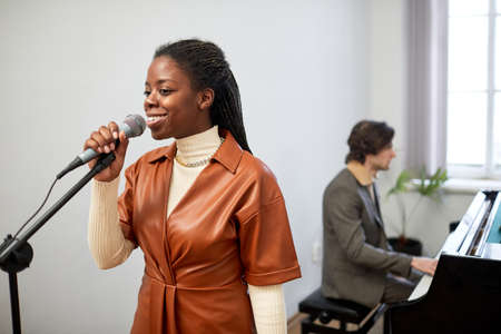 Happy African woman singing a song to microphone during performance with man playing the piano in the background
