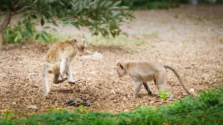 Two monkeys in the forest park are fighting each other. Controversy for leadership, they are fearful, dangerous, threatening and ready to fight. The winner is intimidating and one jumped away in fear