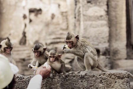 Monkey at Triple Crown Castle (Phra Prang Sam Yod) Lopburi, Thailand. Religious buildings constructed by the ancient Khmer art. select focus Monkey Relax at Prang Sam Yod, Lopburi, Thailand