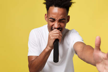 Stylish afro american man singing into microphone isolated on a yellow gold background
