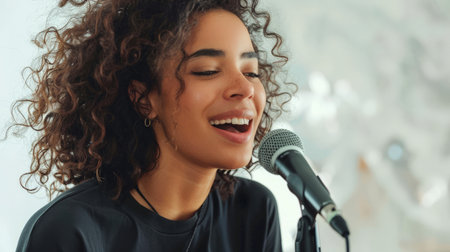 Young cheerful female singer in black shirt with curly hair singing song into microphone during rehearsal on white background