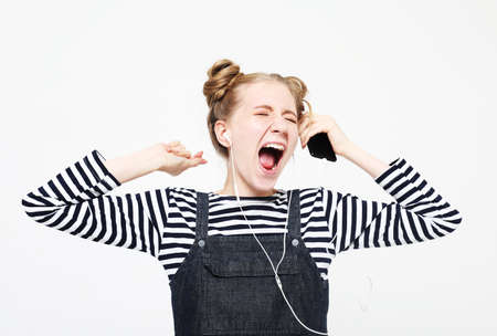 Cheerful young blond woman in striped shirt posing isolated on white wall background studio portait. People lifestyle concept. Listen music with headphones and dancing.