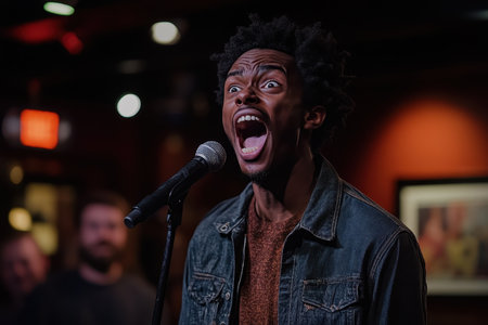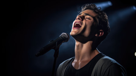Young male artist singing passionately on stage with vibrant concert lighting.