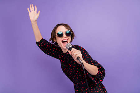 Portrait of attractive cheerful girl singing. isolated over bright violet purple color background