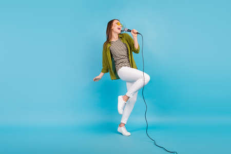 Full body photo of charming happy young woman enjoy sing karaoke relax isolated on blue color background