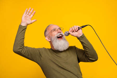 Photo of funky old white beard man sing in mic wear eyewear green sweater isolated on yellow color background