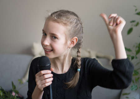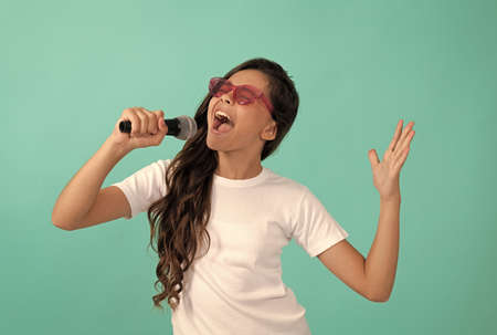 piece of music. make your voice louder. teen girl singing song with microphone. having a party. Happy kid with microphone. karaoke concept. Singing Songs. Lifestyle and People Concept
