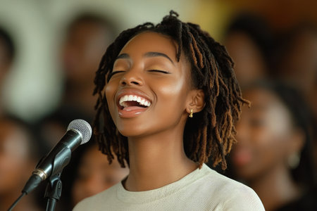 A striking image of passionate vocalists performing in harmony, showcasing emotion and connection, illuminated by stage lights, capturing the essence of live music and community spirit.