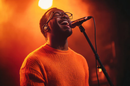 A man in glasses and an orange sweater sings passionately into a microphone on a warmly lit stage, capturing musical emotion and performance joy.
