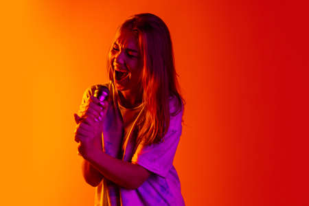 Cropped portrait of young beautiful caucasian girl expressively singing with microphone on gradient yellow red background