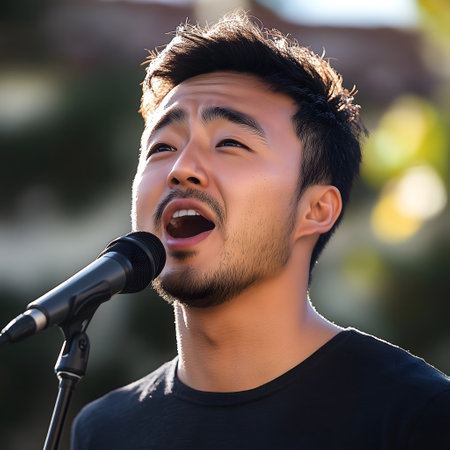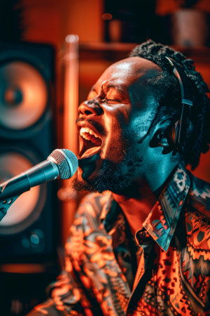 A vibrant image of a man passionately singing into a microphone. The colorful background and expressive pose capture the energy and emotion of a live performance, highlighting the artistry of music.
