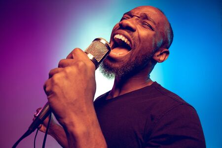 Young african-american jazz musician singing a song on gradient purple-blue background. Concept of music, hobby. Joyful attractive guy improvising, having a concert. Colorful retro portrait of singer.
