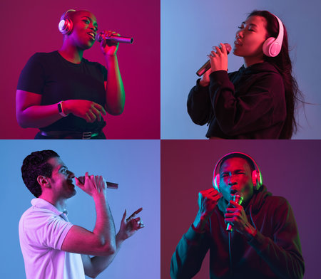 Collage of portraits of young people with microphones isolated over multicolored backgrounds in neon light.