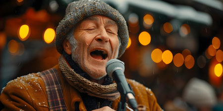 Elderly man with gray hair and suspenders sings Christmas carols at a festive party. Concept Elderly, Man, Gray Hair, Suspenders, Christmas Carols, Festive Party