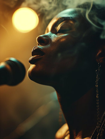 A woman is singing into a microphone with smoke coming out of her mouth. Concept of passion and intensity as the woman performs