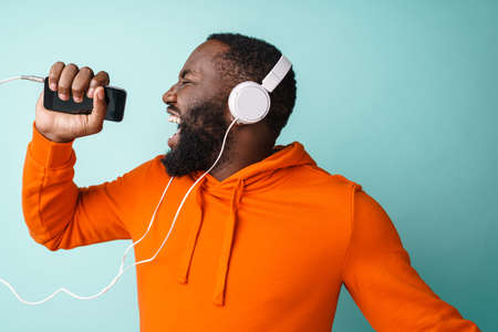 Happy young african man listening to music with wireless headphones dancing isolated over blue background, holding mobile phone