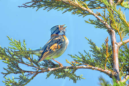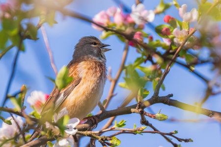 Closeup portrait of a Linnet bird female, Carduelis cannabina, display and searching for a mate during Spring season. Clear blue sky