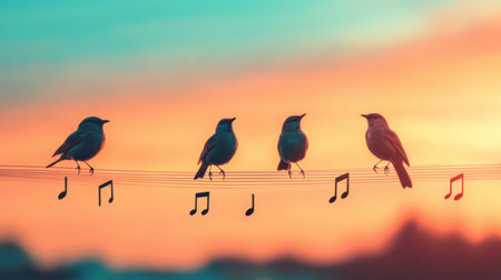 Four birds sit gracefully on musical notes as the sun sets, blending vibrant colors and a serene atmosphere, capturing the essence of nature and music.