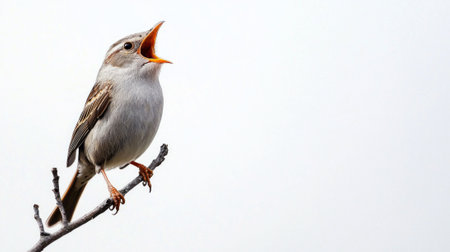 Perched on a slender branch, a nightingale opens its beak wide, filling the air with enchanting melodies against a serene white backdrop, capturing the beauty of nature.