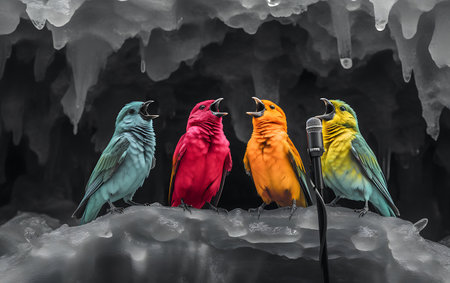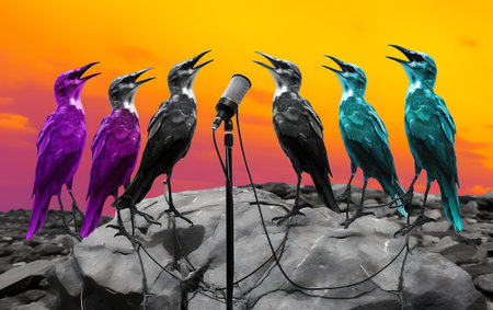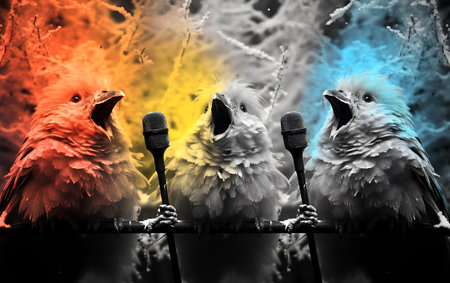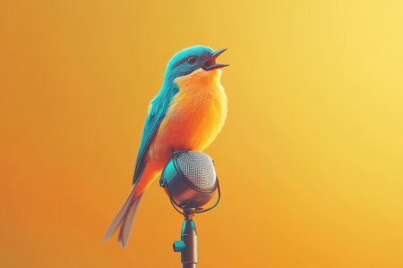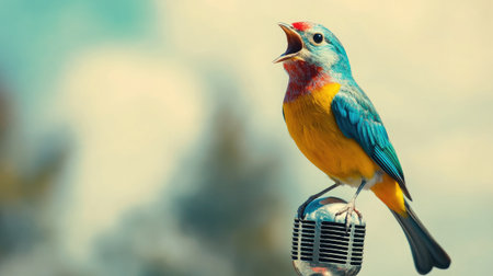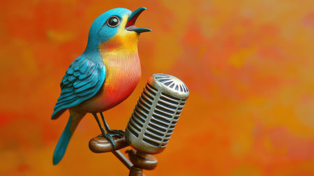 A vibrant bird sings into a classic microphone, evoking a whimsical music festival stage performance.