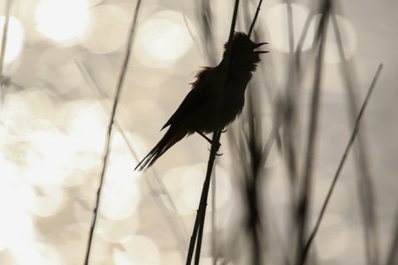 Reed warbler bird silhouette rests on dried plants at tranquil spring dusk