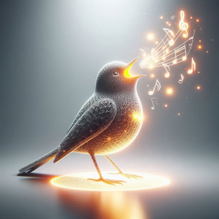 A small bird perches on a retro microphone, performing a melodious song, representing a music contest vibe.
