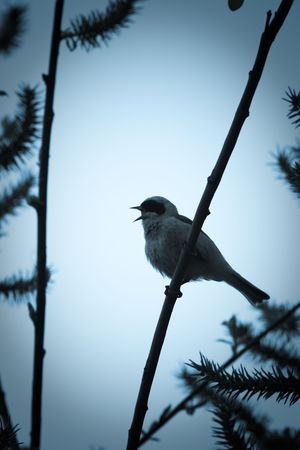 The bird perching on a branch of the tree. The male sings a love song.