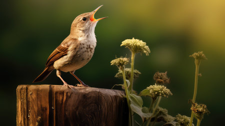 Wild songbird nightingale singing at sunrise while perched on a thin branch. Soft bokeh background, capturing a peaceful moment in nature with golden morning light.
