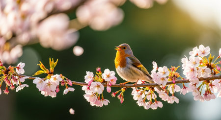 A vibrant bluebird with orange breast feathers perches on a flowering branch. The bird opens its beak, suggesting a song. Pink cherry blossoms and soft green foliage create a natural environment. The composition features a shallow depth of field, suitable for various editorial and commercial purposes.