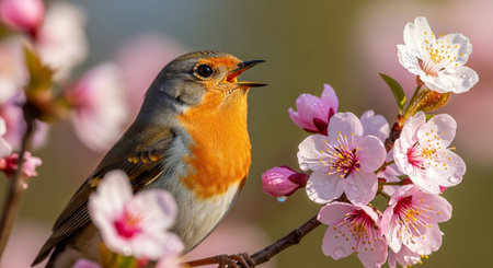 Robin singing on cherry blossom branch in spring sunlight