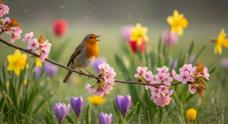 Vibrant Robin Perched on Blossoming Branch in Springtime Light