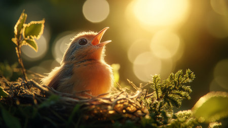 An enchanting shot of a baby bird chirping from its nest at dawn, with soft morning light illuminating its delicate features, evoking a sense of new beginnings.