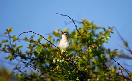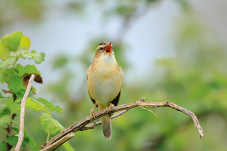Closeup of a Sedge Warbler bird, Acrocephalusschoenobaenus, singing to attract a female during breeding season in Springtime