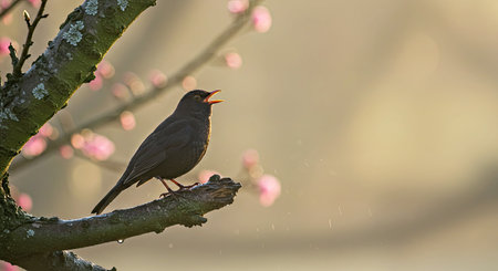 Captivating close-up of a blackbird singing in warm evening light, perfect for showcasing the beauty and sounds of wildlife in its natural environment.