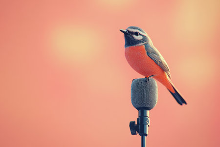 A bird perched on a microphone stand. The bird is small and he is a robin. The microphone stand is black and has a silver microphone on top. The background is a pinkish-orange color with Generative AI