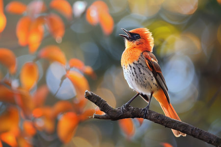 A bright bird sings while standing on a branch surrounded by colorful autumn foliage.