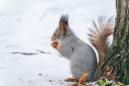 Portrait of a squirrel in winter on white snow background. Eurasian red squirrel, Sciurus vulgaris